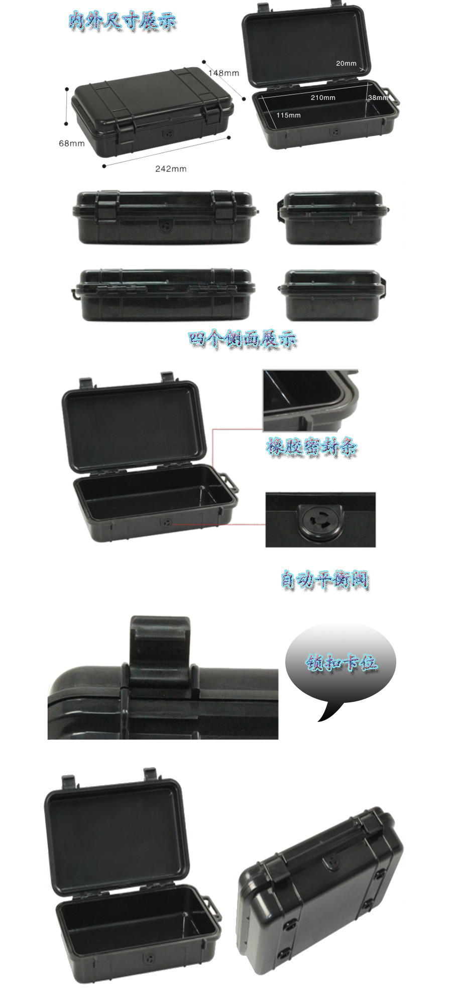 簡(jiǎn)要說明:廣泛用于傳媒、公安、消防、軍隊(duì)、航空、戶外攝影、野外考察、科學(xué)探測(cè)等眾多領(lǐng)域的高端儀器、儀表。具有高強(qiáng)度、高抗壓沖擊、防潮、絕對(duì)密封、防塵、防水等特點(diǎn)。產(chǎn)品材質(zhì):ABS原料,箱體采用高抗沖擊的高分子聚合材料一體注塑成型,密封采用扁型彈性發(fā)泡密封橡膠條,確保防水氣密,所有較軸均采用不銹鋼材質(zhì)。
