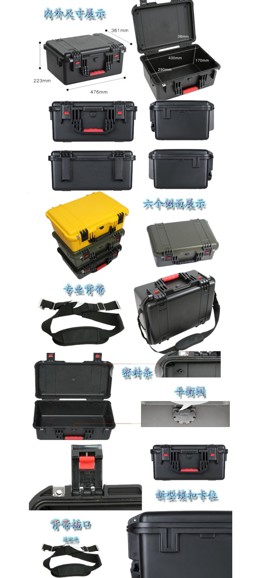 簡(jiǎn)要說(shuō)明:廣泛用于傳媒、公安、消防、軍隊(duì)、航空、戶(hù)外攝影、野外考察、科學(xué)探測(cè)等眾多領(lǐng)域的高端儀器、儀表。具有高強(qiáng)度、高抗壓沖擊、防潮、絕對(duì)密封、防塵、防水等特點(diǎn)。產(chǎn)品材質(zhì):ABS原料,箱體采用高抗沖擊的高分子聚合材料一體注塑成型,密封采用扁型彈性發(fā)泡密封橡膠條,確保防水氣密,所有較軸均采用不銹鋼材質(zhì)。